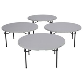 The set includes four round 60 inch diameter folding tables made of hdpe plastic with steel frames and legs.